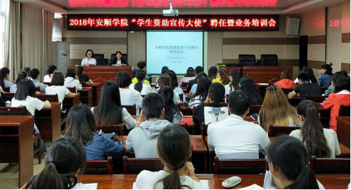 为更好地开展我校学生资助宣传工作, 秉着“保证学生不因家庭经济困难而放弃学业”的资助理念,2018年6月22日下午1:00,学生资助管理中心在特教大楼七楼会议室开展安顺学院2018年“学生资助宣传大使”暨业务培训会。培训会由谢卿主讲,资助中心工作人员、各学院学生资助宣传大使100余人参加了培训会。